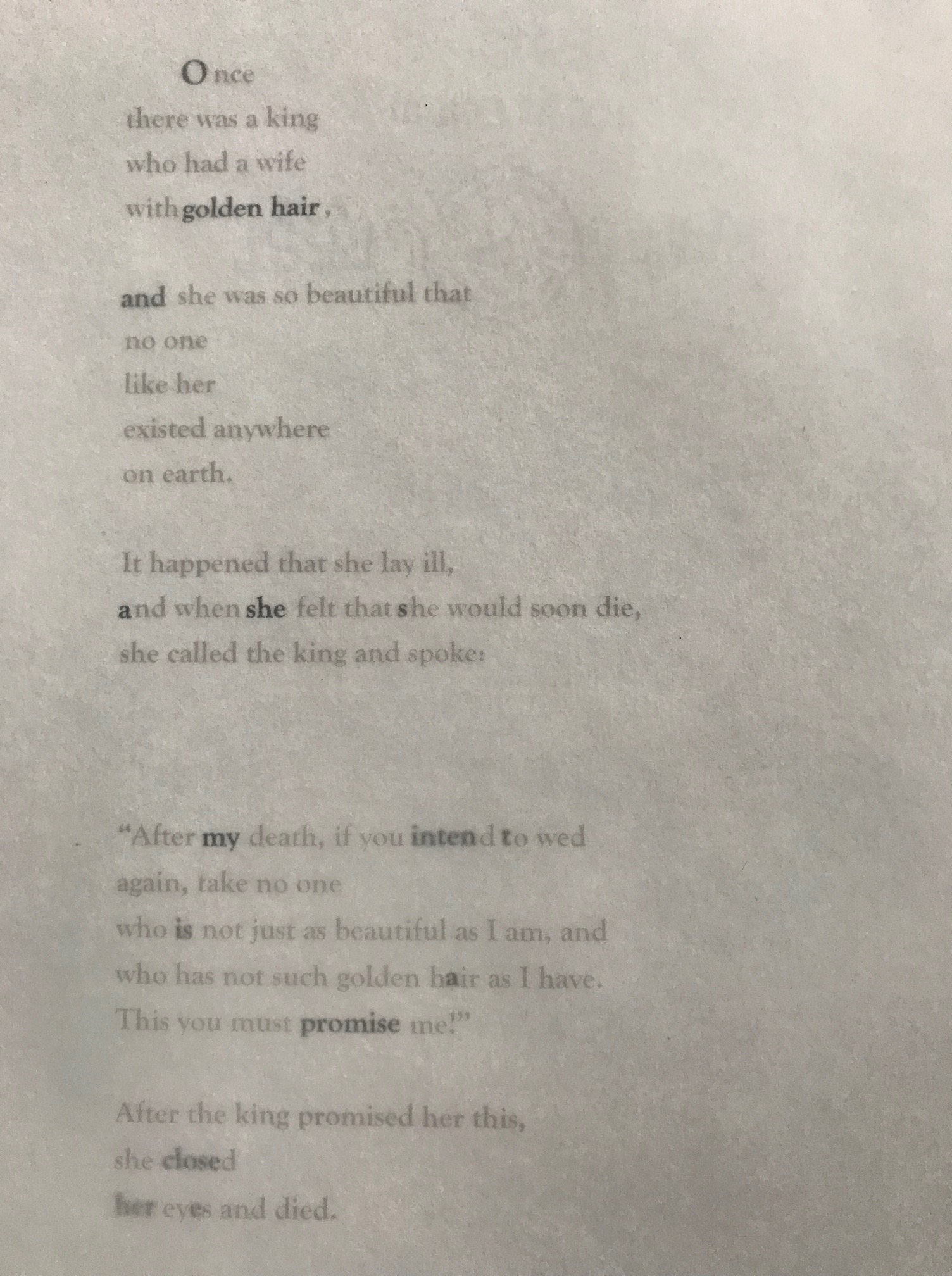 As she looked, puzzled, at the stapled sheets of paper lying before her, I said, “Just turn the top page only, the translucent page. See, as you do that, you’re lifting the gray words of the Grimms’ tale up and away. You’re erasing the Grimms’ words, yourself, to reveal the poem underneath: