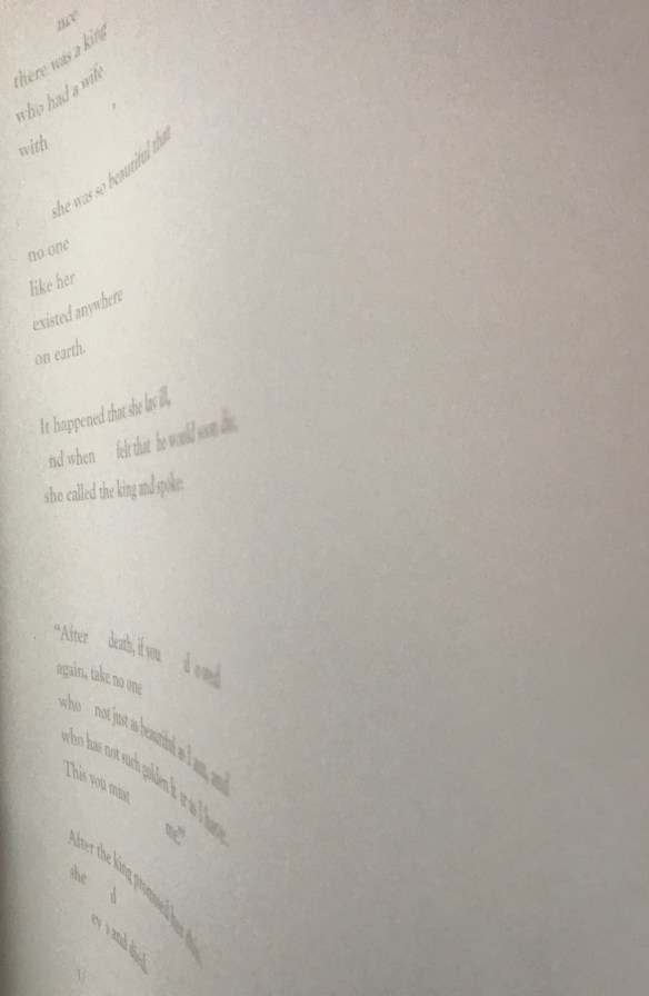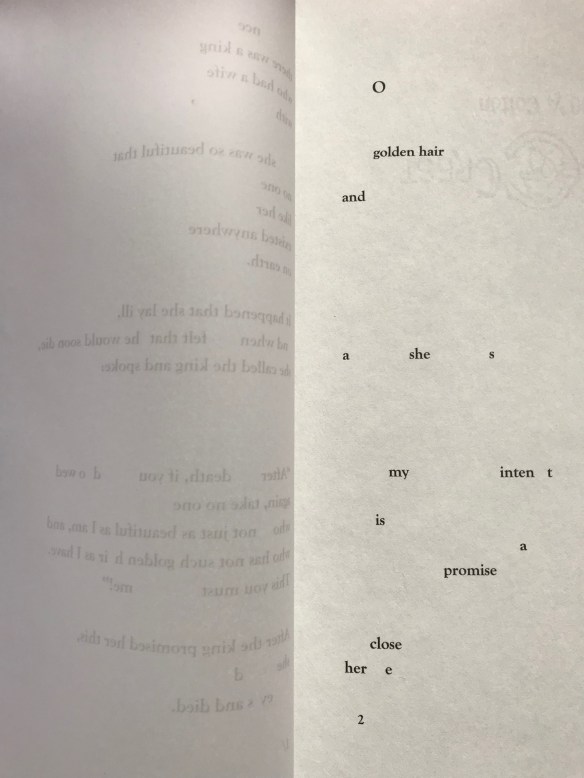 “See,” I said, as I laid page 1 / 2 down on the table in front of her, “I’d like to have each “page” in the book you have be made of two pages—the top page would be translucent with a section of the Grimms’ tale printed in gray font on it, the Grimms’ tale, that is, minus the words and letters that I’ve selected for the erasure poems. The underlying page would be white paper with the erasure poems in black font. When the top page lies on the underlying page, you can read both Grimms’ tale and erasure poem”: